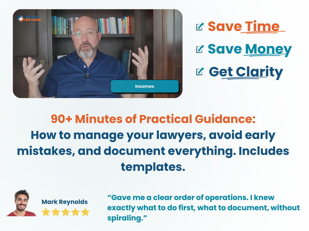 Your Legal + Financial checklists are ready. While you’re here, the fastestway to use them correctly is the full Divorce Like a Man Video Course.